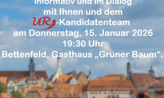 An alle Freunde der UR (Unabhängige Rothenburger e.V.). Die neue Internetseite ist nun Online. Hier findest du auch die Termine für die Wahlveranstaltungen in Rotenburg, Bettenfeld und Leuzenbronn, wo ihr mit mir und den anderen Stadtratskandidaten in Kontakt kommen könnt. (https://ur-rothenburg.de) Freuen uns auf euch und bis dann.